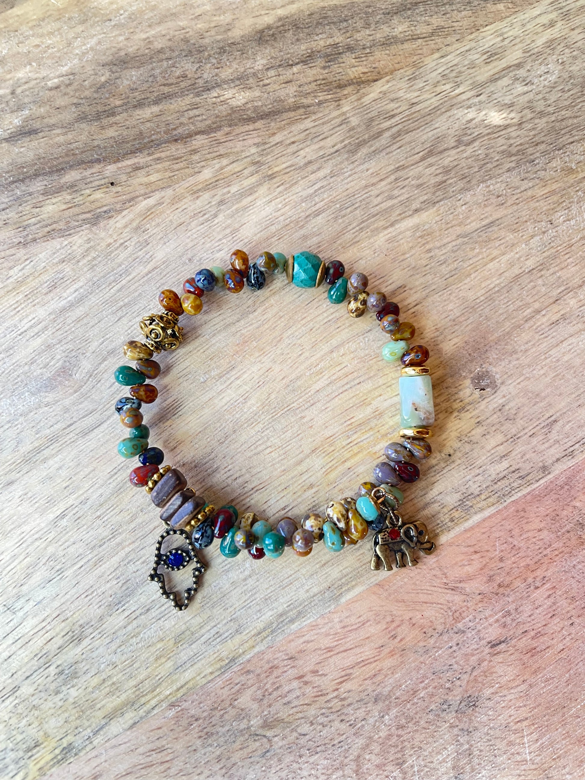 Embrace your wild side with this audacious wired wrap bangle bracelet. Strung with vibrant assorted Czech glass beads in a kaleidoscope of colors, each bead catches the light with mesmerizing depth. The design peaks with two striking bohemian charms—a majestic elephant symbolizing strength and wisdom, paired with a protective hamsa hand. This fearless fusion of global influences creates a statement piece that refuses to blend in. Perfect for those who dare to express their individuality through bold, eclectic style. Fits most wrist size.