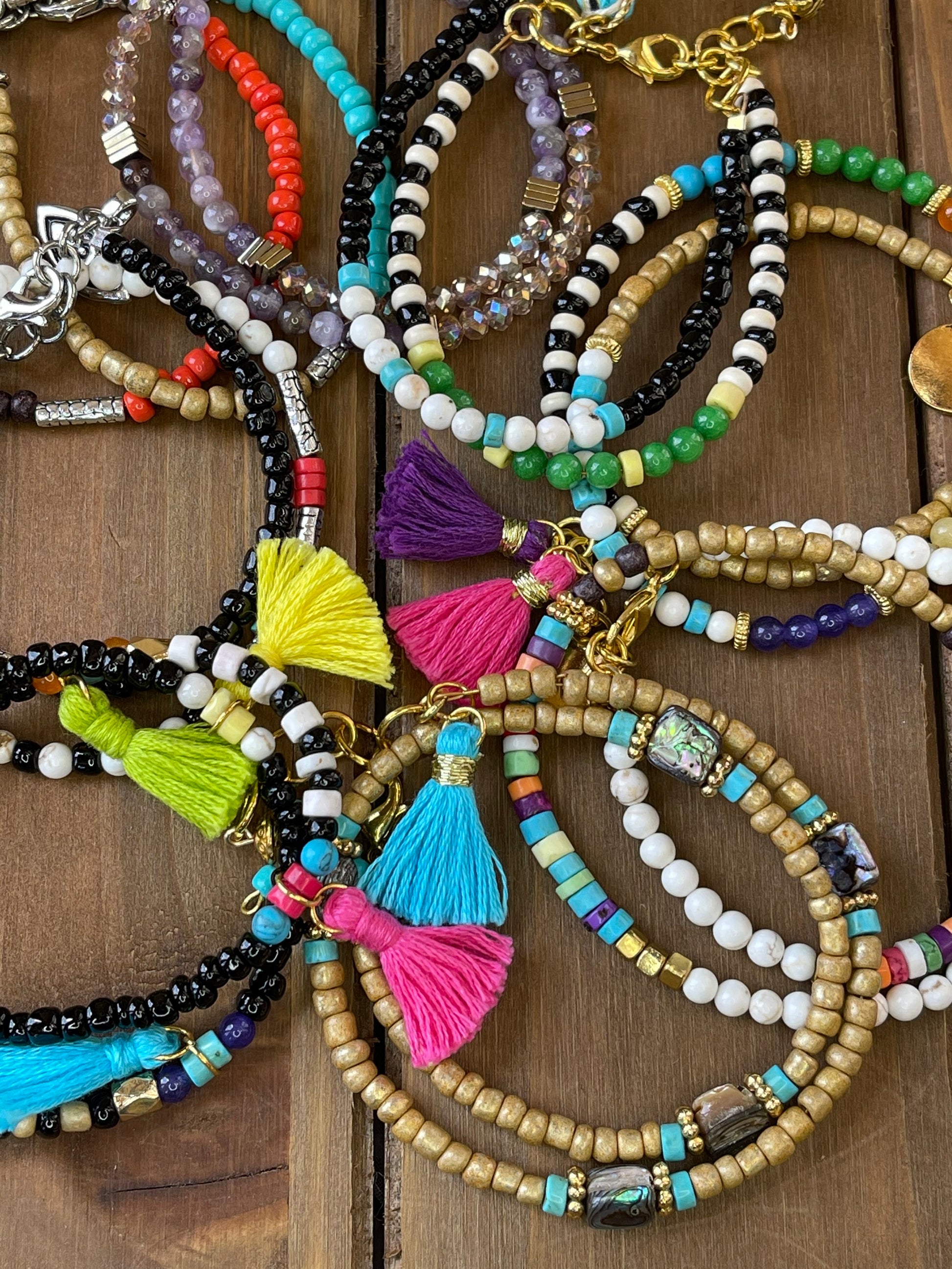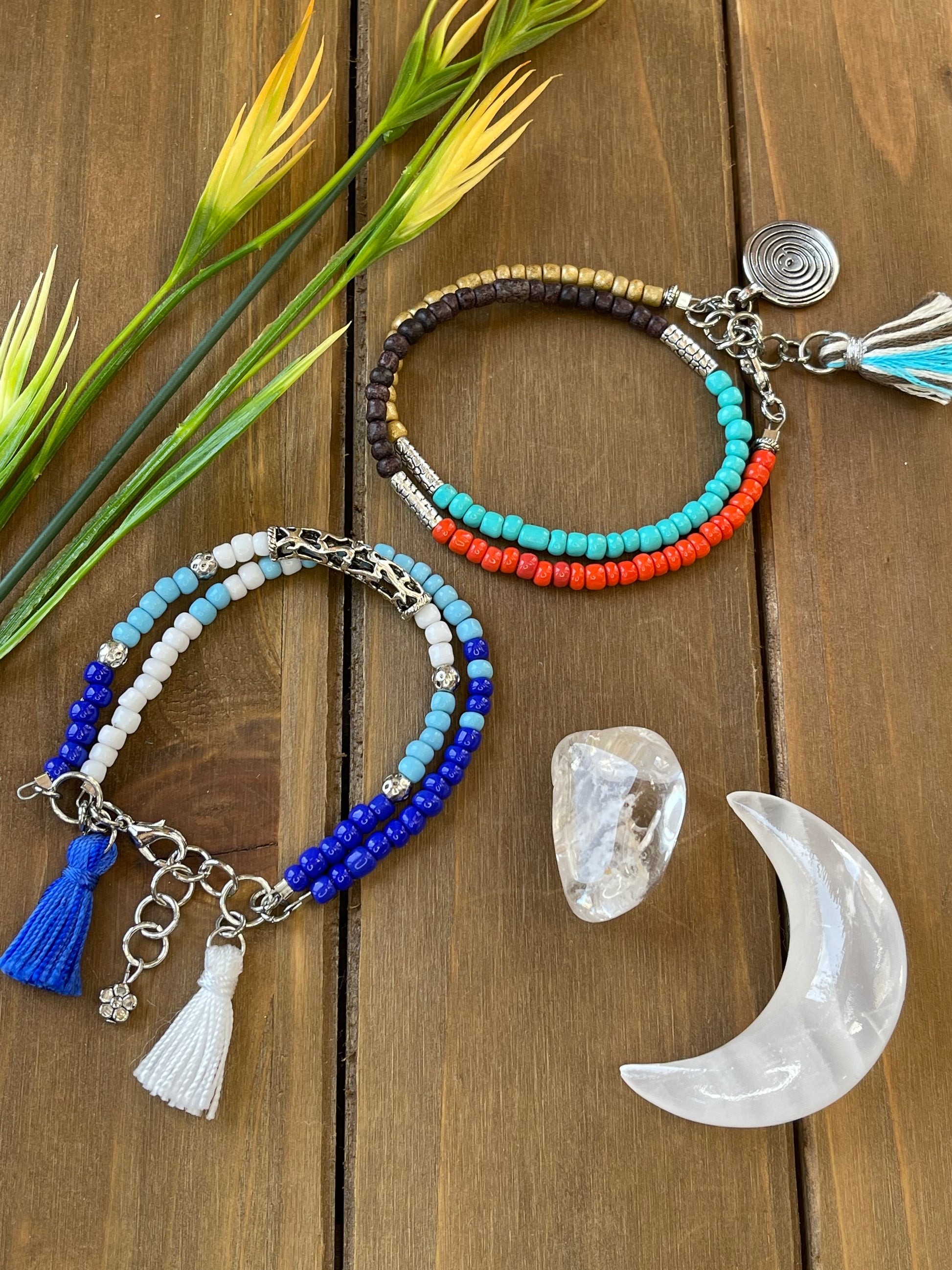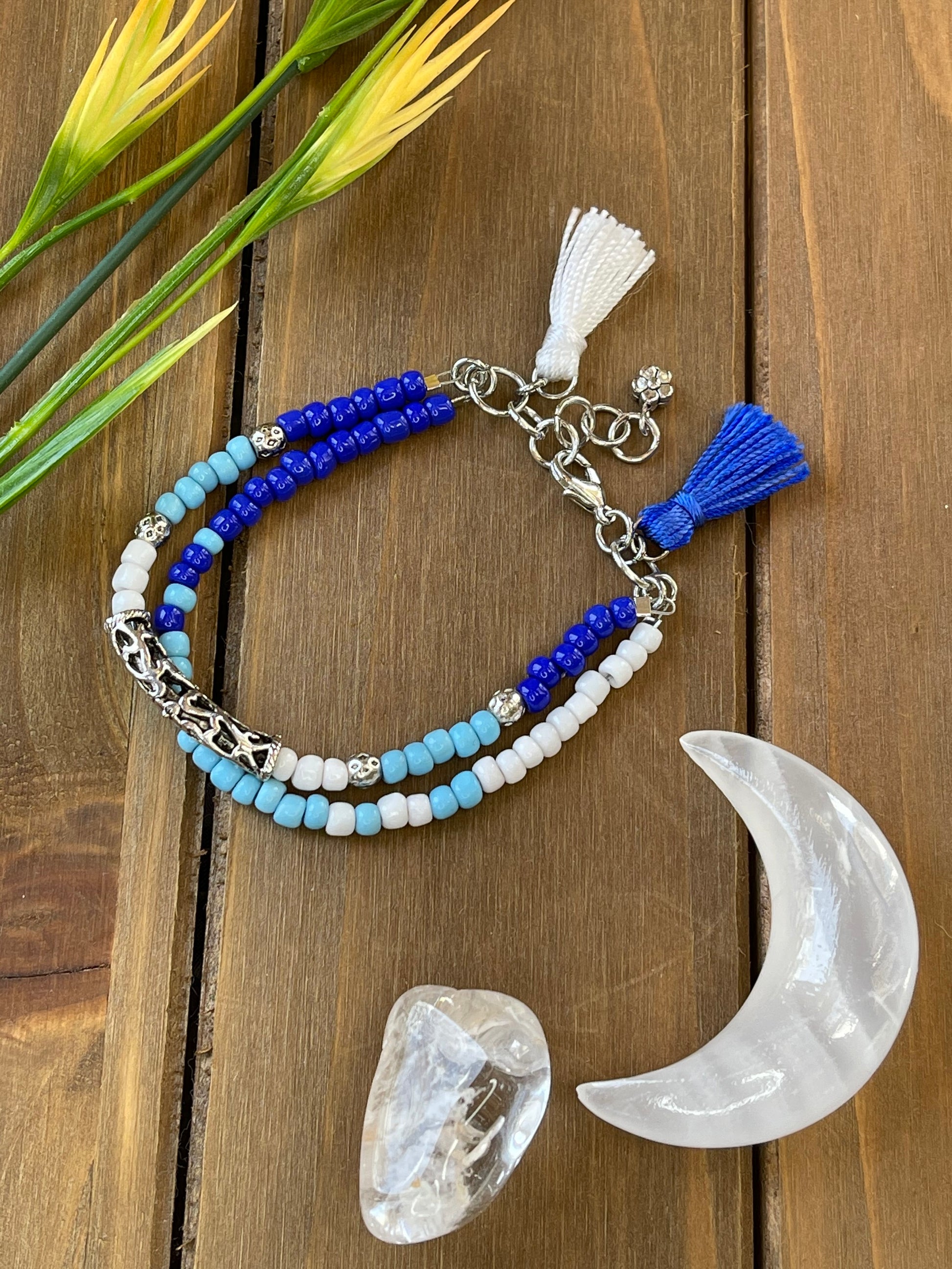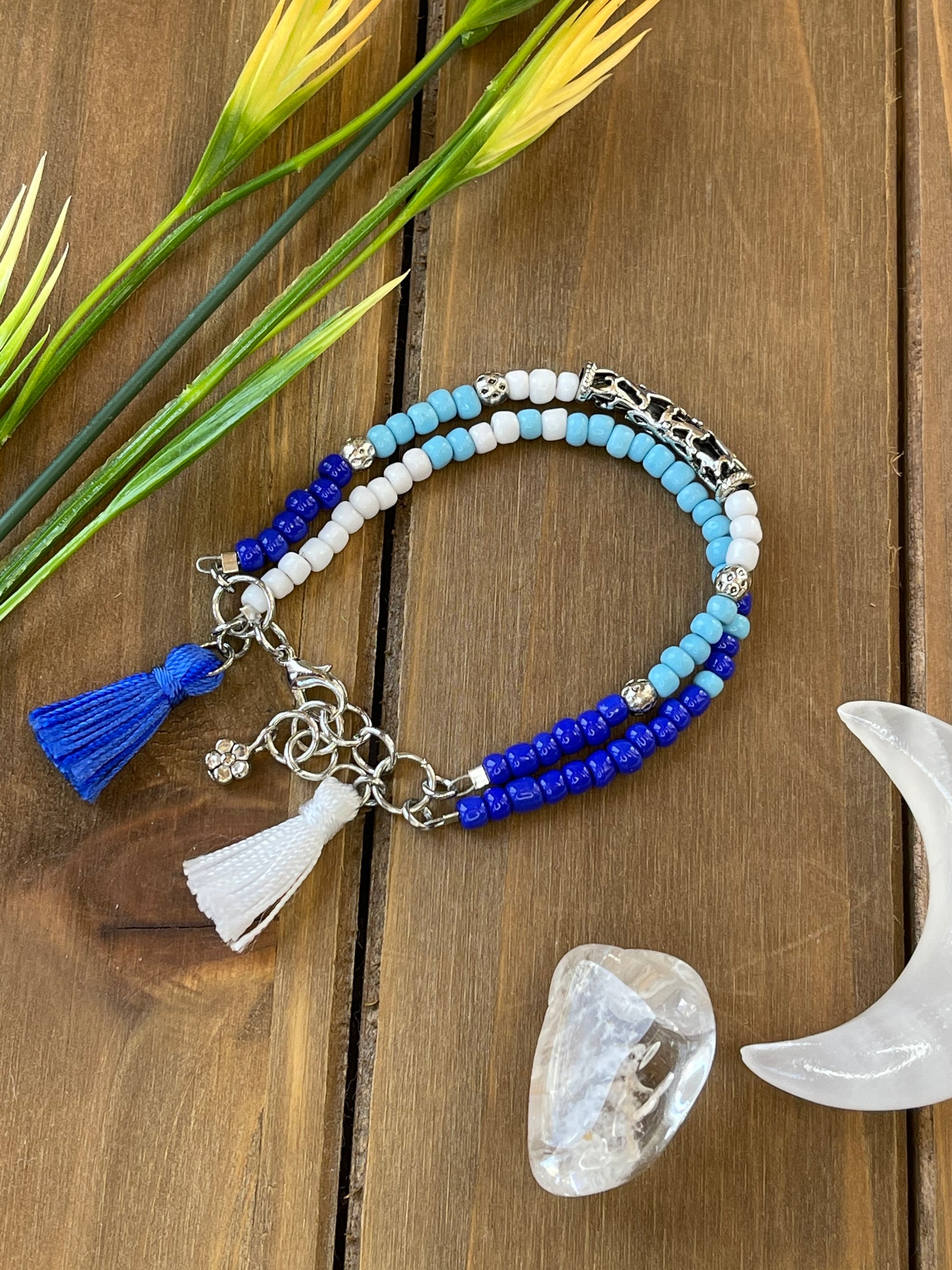 This boho double strand bracelet has summer vibes that makes a perfect accessory for your wrist. It is made of seed beads with colors of cobalt blue, sky blue, and white. All metal components are stainless steel and silver plated. There are a blue and white tassels and a flower charm in silver plated. This bracelet measures 6.5 inches with a 1.25 inch extender for added length.