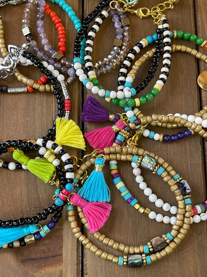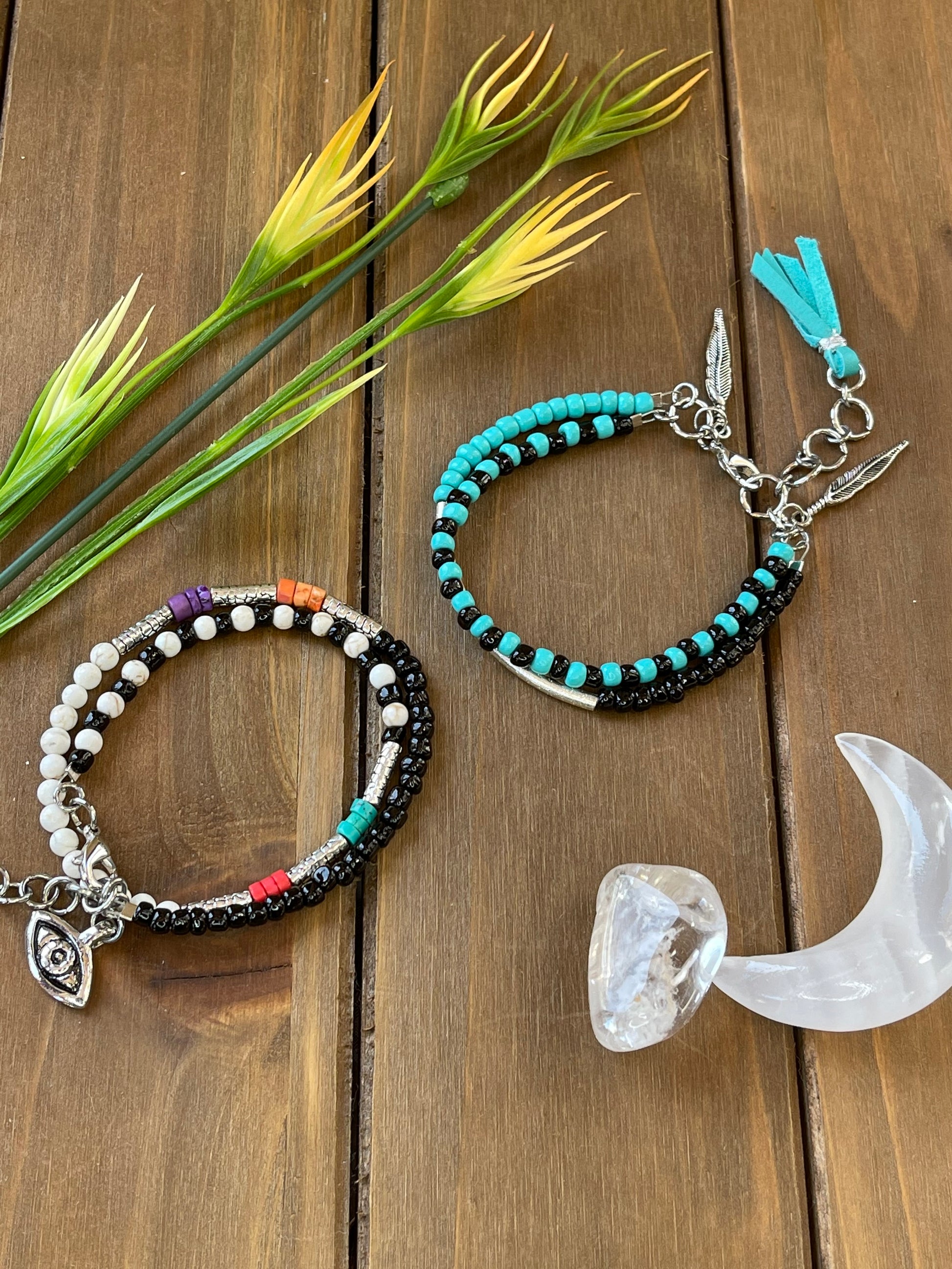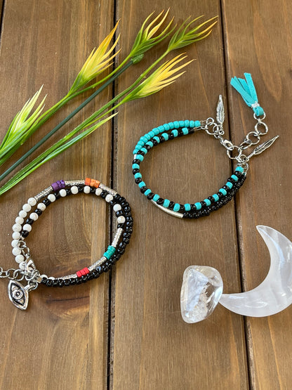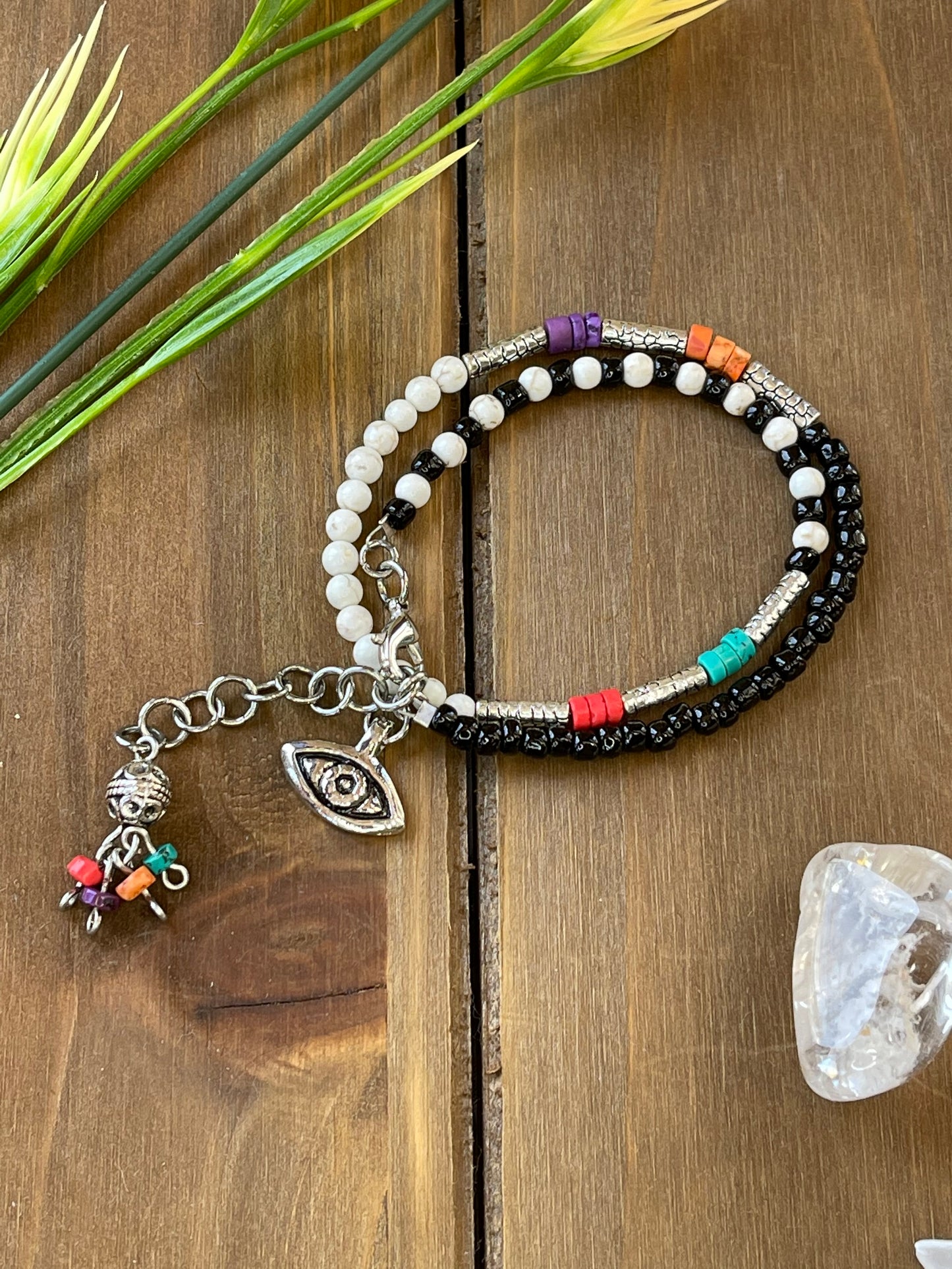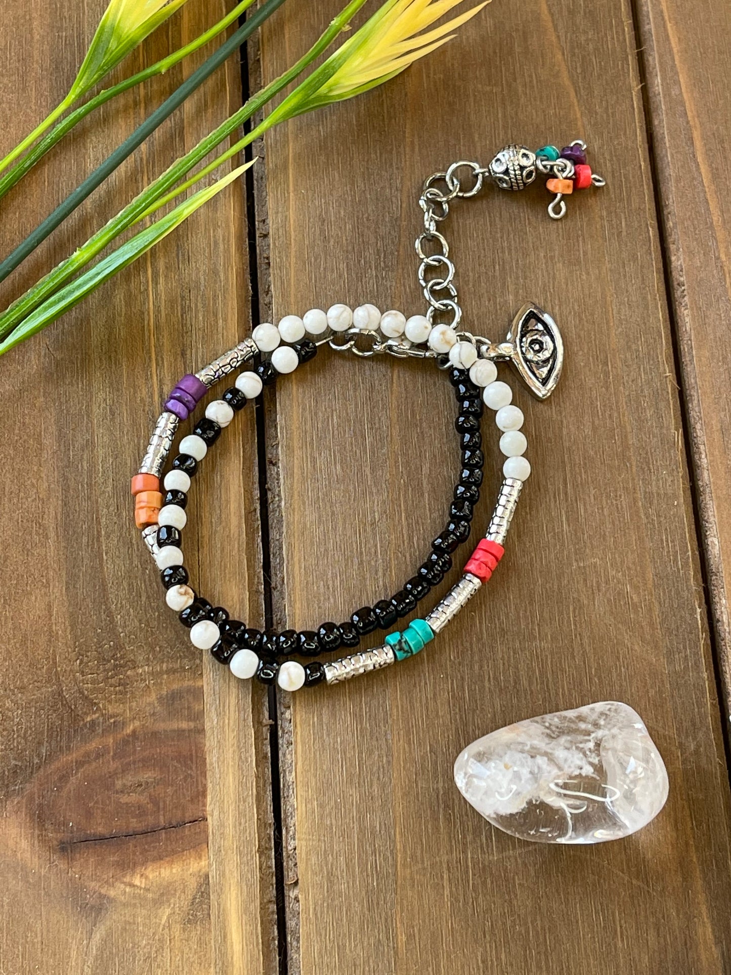 This boho colorful wrap bracelet can also be worn as a choker. It is made of seed beads, white howlite, and heishi colored howlite beads. Charms include a nepal style bead with colored bead fringe and an eye amulet. All metal components are silver plated and stainless steel. This wrap bracelet measures 13.5 inches with a 1.5 inch extender for added length.