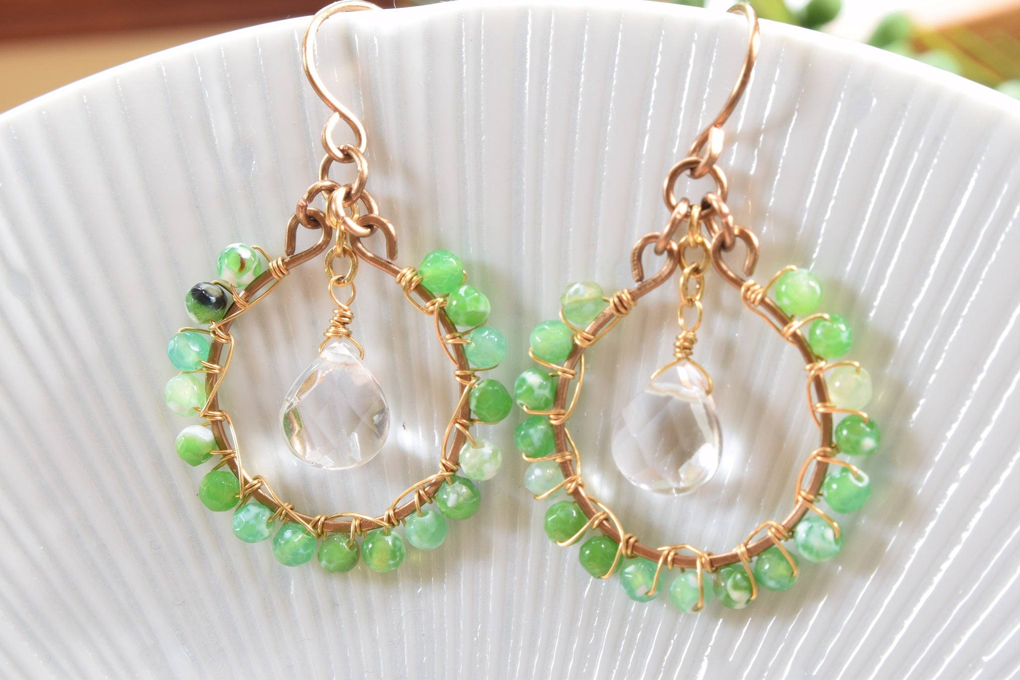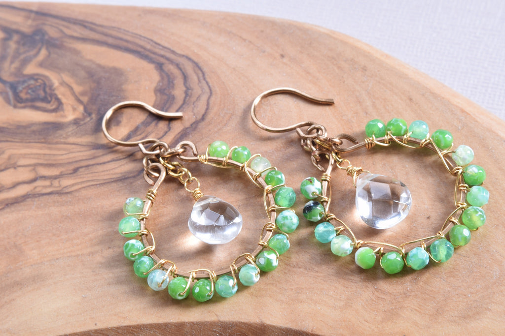 This fun pair is for anyone that loves green! They are designed with spotted green agate mini beads that are hand wired in a hoop style. The center stones are clear faceted quartz for a little sparkle. The metal components are antique gold brass. These earrings measure 2 inches long.
