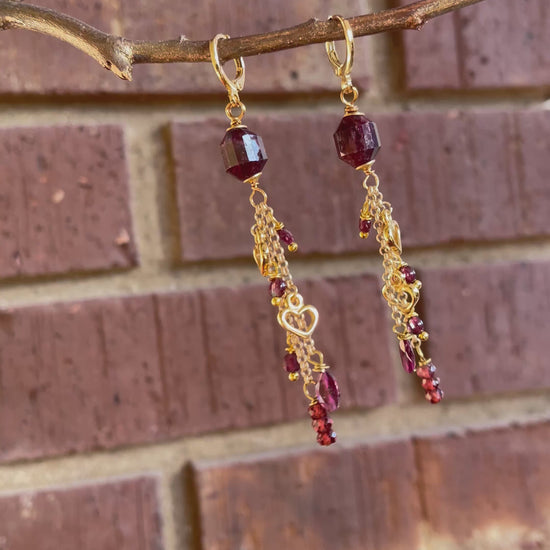Make a statement with these exquisite gold heart earrings, adorned with luxurious deep-red garnets that radiate warmth and sophistication. Perfect for those who cherish meaningful jewelry, these pieces combine romantic heart shapes with the captivating allure of premium garnets. Each earring catches the light beautifully, adding instant elegance to any ensemble. Whether you're drawn to symbolic heart designs or the mesmerizing beauty of garnet gemstones, these earrings deliver both sentiment and style. An investment piece that celebrates your unique taste and becomes a treasured favorite. These earrings are 3' long.