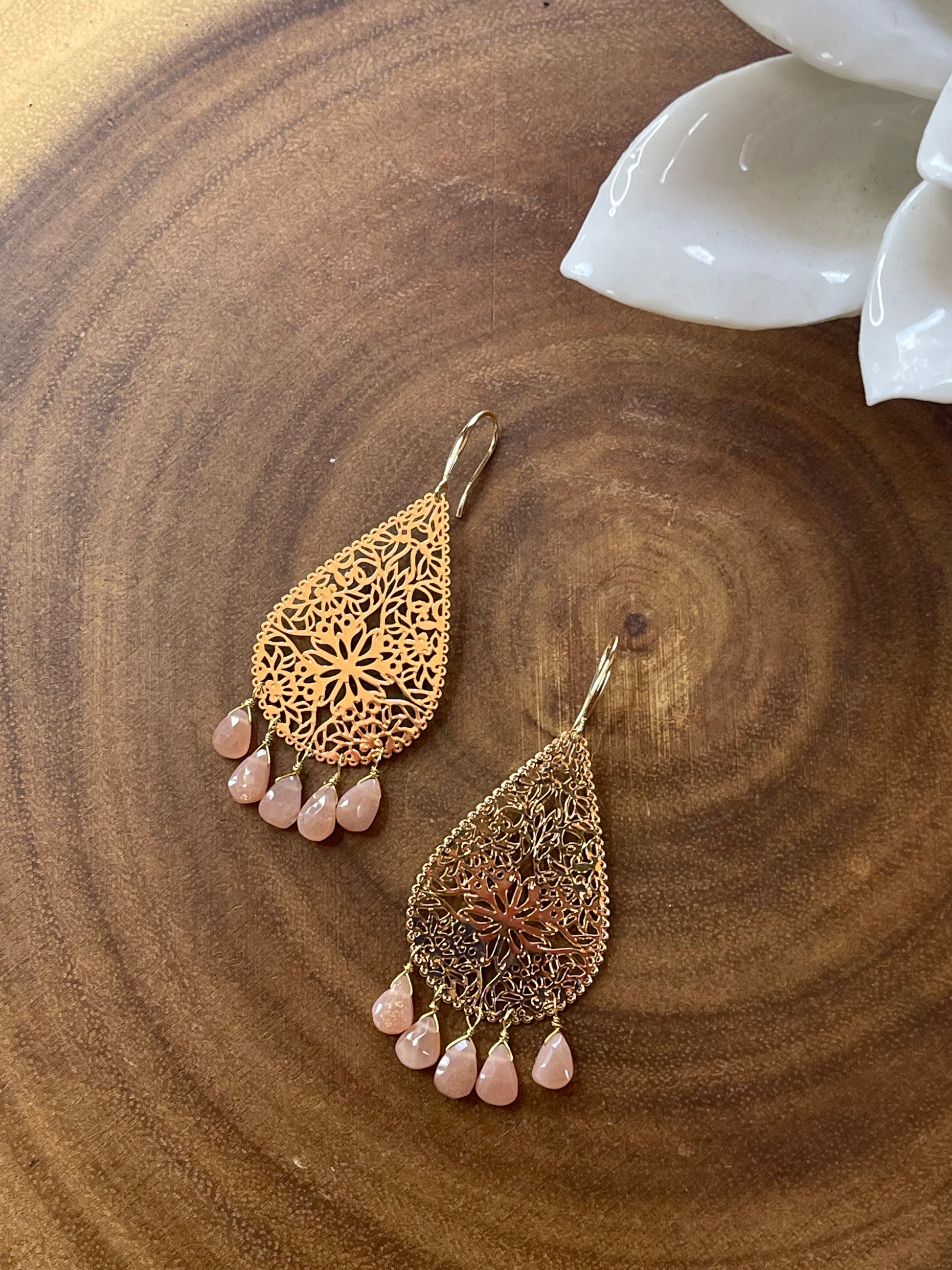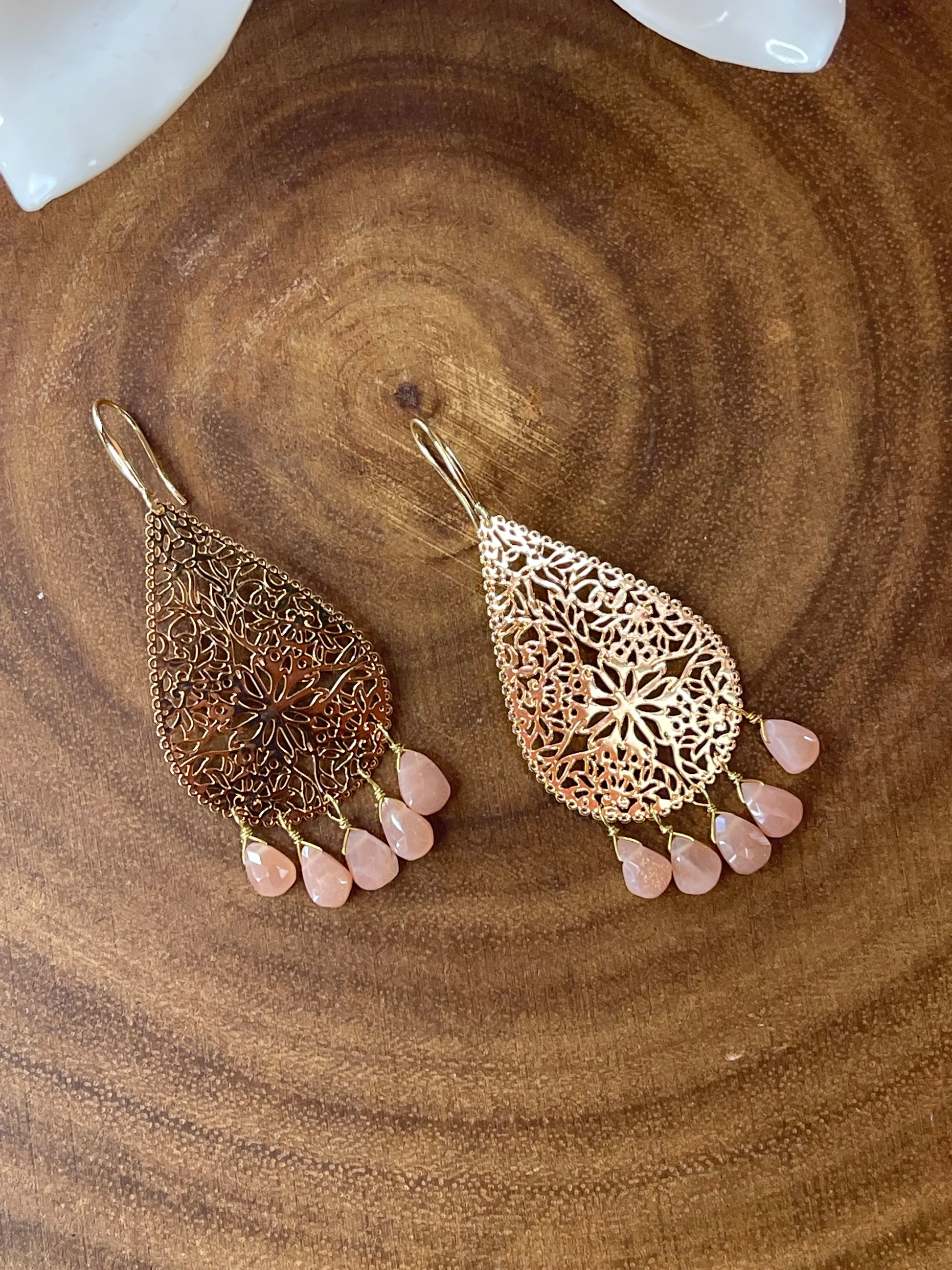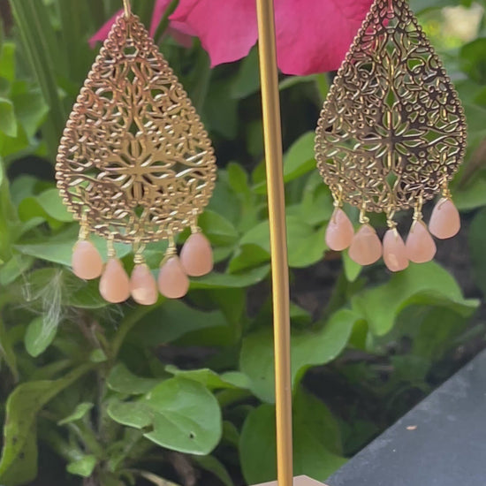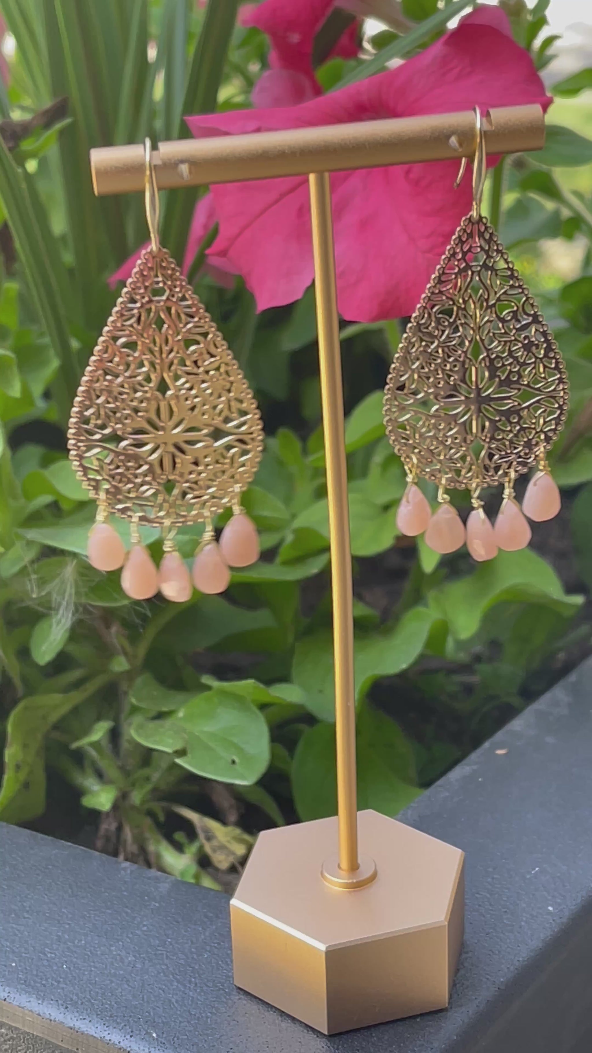 These elegant, sophisticated chandelier earrings feature filigree teardrop connectors and are made of gold plated nickel and lead free brass. Choose from three stunning gemstone options: rainbow tourmaline, peach and white rainbow moonstones. At 2.25 inches in length, these earrings are the perfect addition to any outfit.