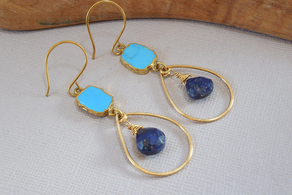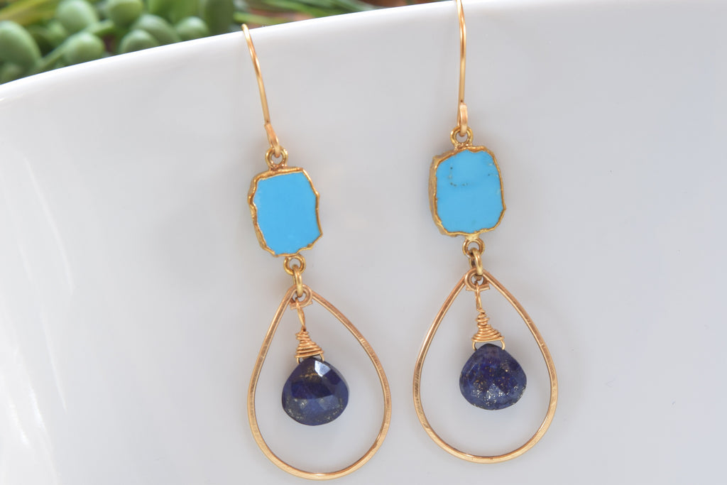 If you love blue, then these earrings have the best of both worlds! Turquoise and lapis lazulli compliment one another really well. The turquoise connectors have dipped gold edges with gold brass hoop surrounding the lapis lazuli teardrop gemstones. These earrings measure 2.5 inches long