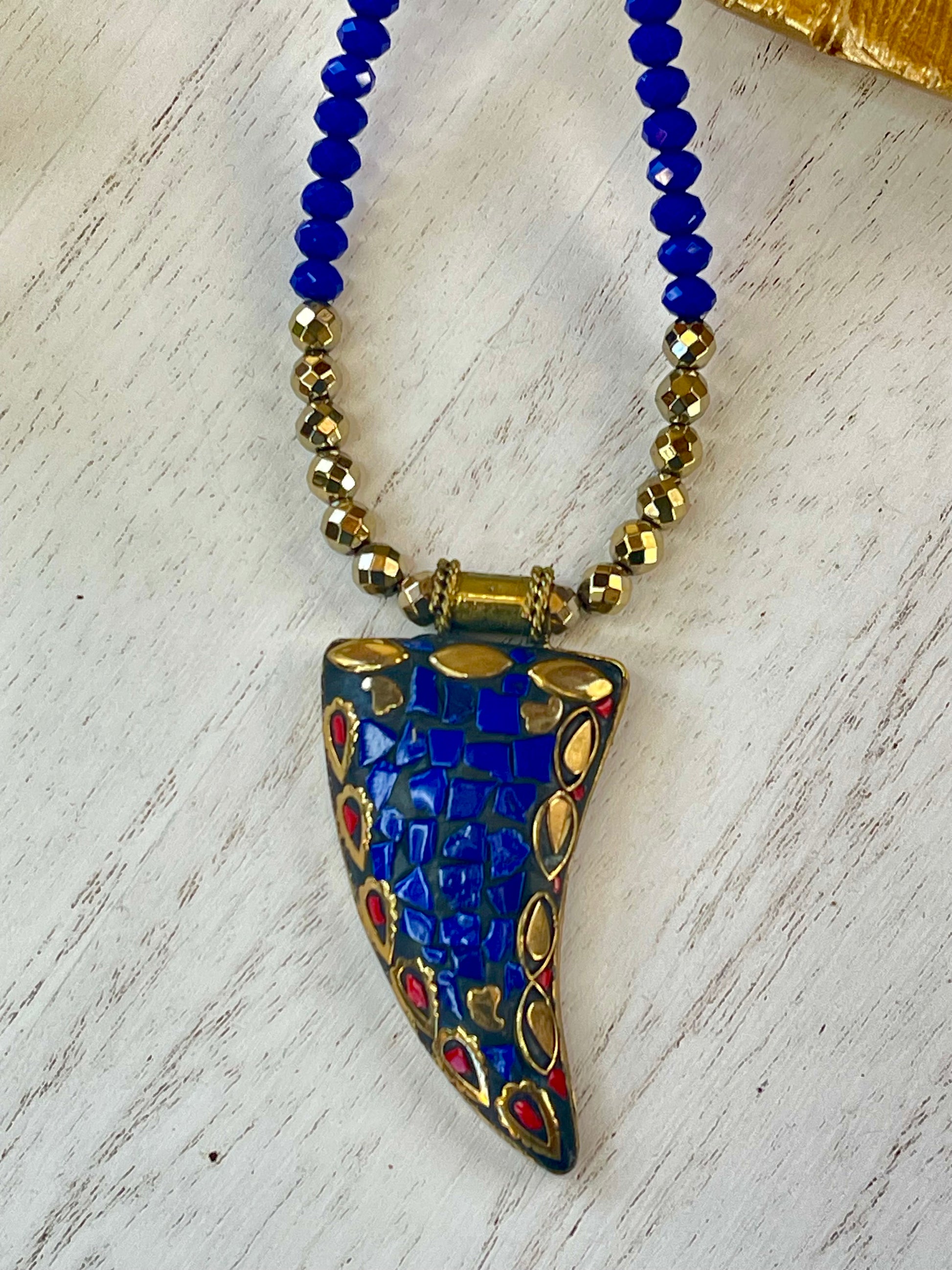 This exquisite necklace features a striking pendant crafted from brass, lapis lazuli, and vibrant red coral, creating a harmonious blend of rich colors and textures. The pendant is suspended from a delicate 16.5" strand of gold hematite beads and shimmering blue glass crystals, finished with a 1" extender for adjustable length. Designed to capture attention, this statement piece combines natural elements with refined craftsmanship, offering both elegance and distinctive style for any occasion.