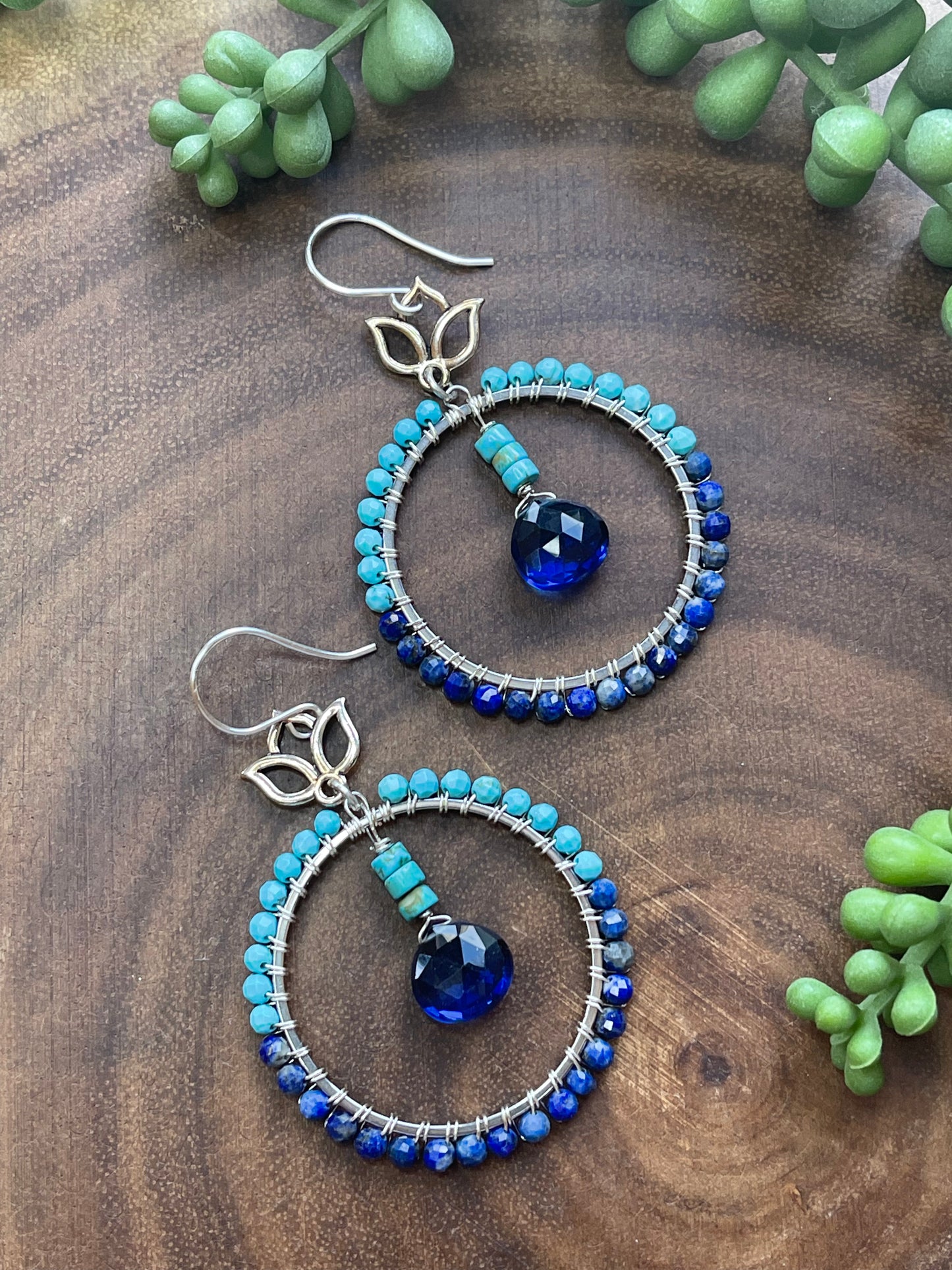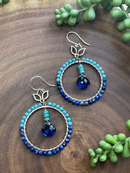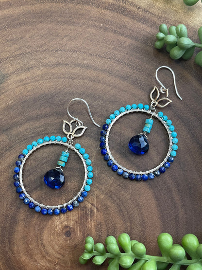 Crafted with care, these hoops boast a blend of turquoise and lapis lazuli beads, intricately hand-wired. The focal point features eye-catching turquoise heishi beads and striking cobalt blue teardrops. All metal parts, including the lotus charm connectors, are silver-plated. Each earring measures 2.5 inches in length.