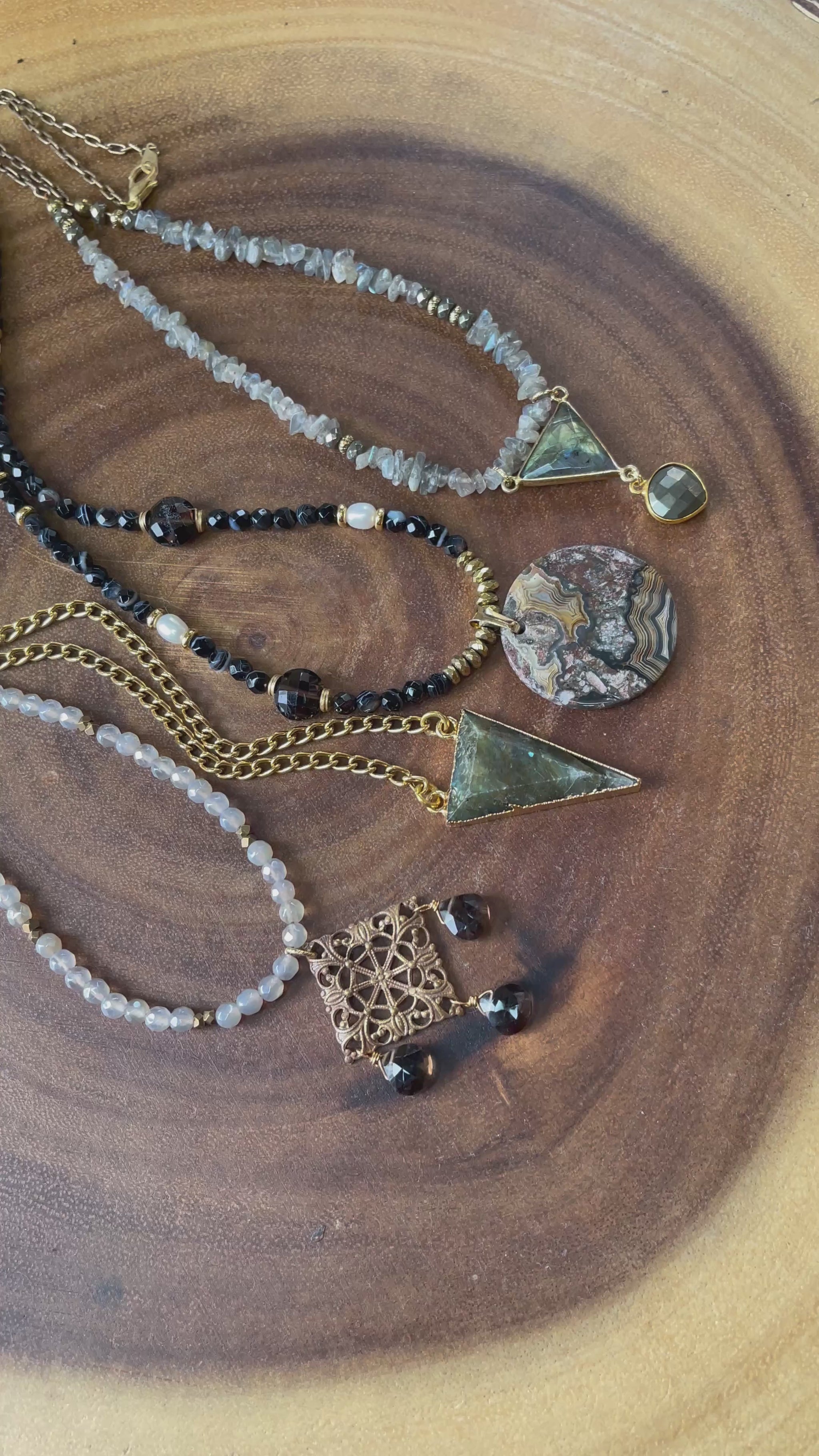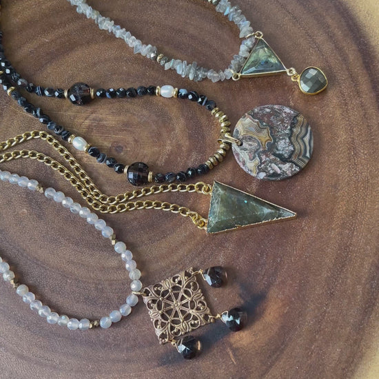 Featuring a vintage-inspired aesthetic, this necklace presents a refined and delicate feminine design. It is meticulously crafted from mystic agate beads, smoky quartz, brass, and finished with gold plating. The necklace measures 15.5" and includes a 1" chain extender, with the option to customize the length by adding a longer extender upon request. Please contact me if you would like a longer necklace.